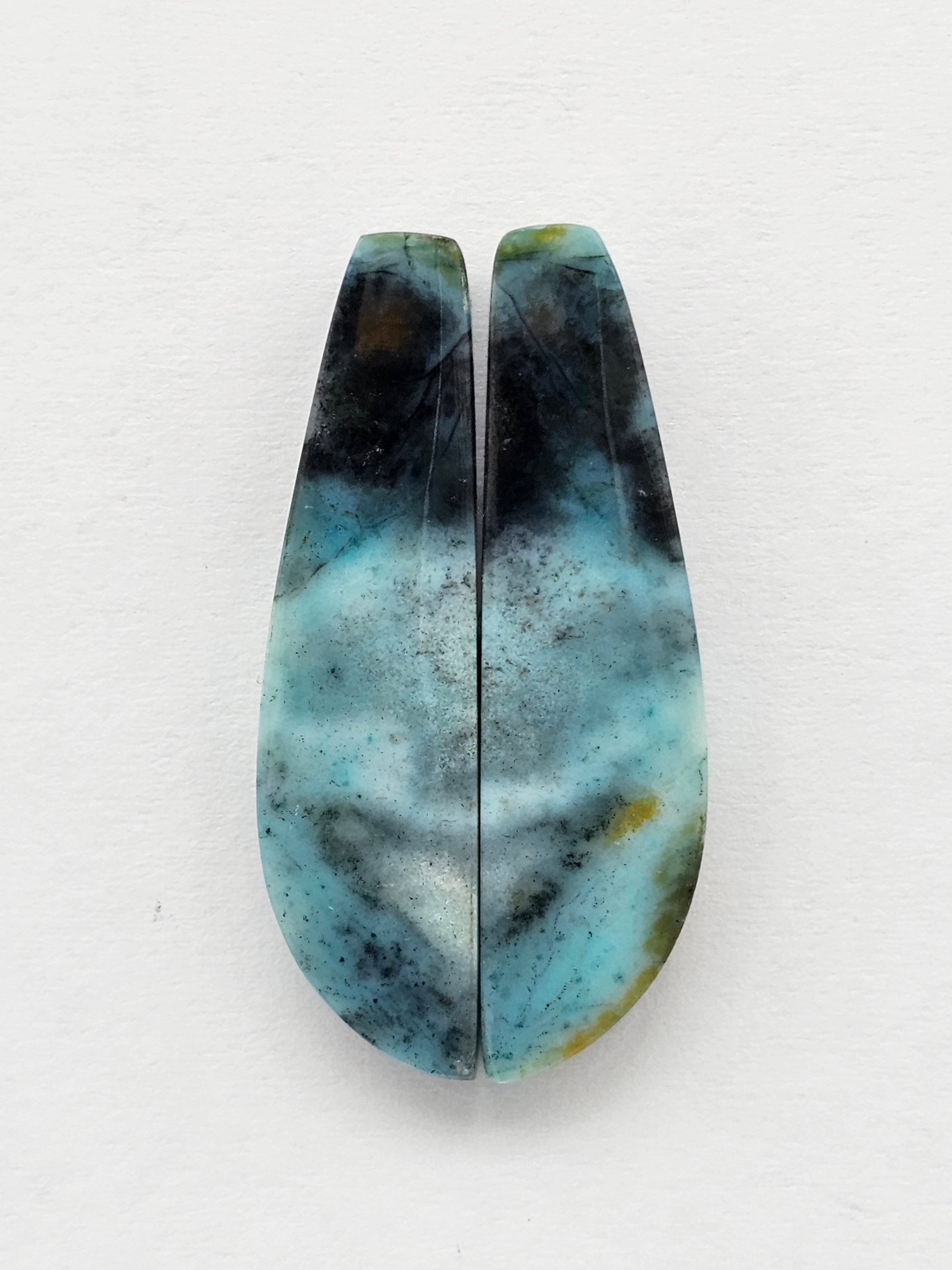 This exquisite cabochon pair showcases a refreshing blend of vibrant blue hues accented with earthy golden tones and intricate natural patterns. The elongated, tapered design makes this stones ideal for earrings, pendants, or other custom jewelry creations. Polished to highlight their unique character, these cabochons bring a touch of natural beauty and elegance to any design.