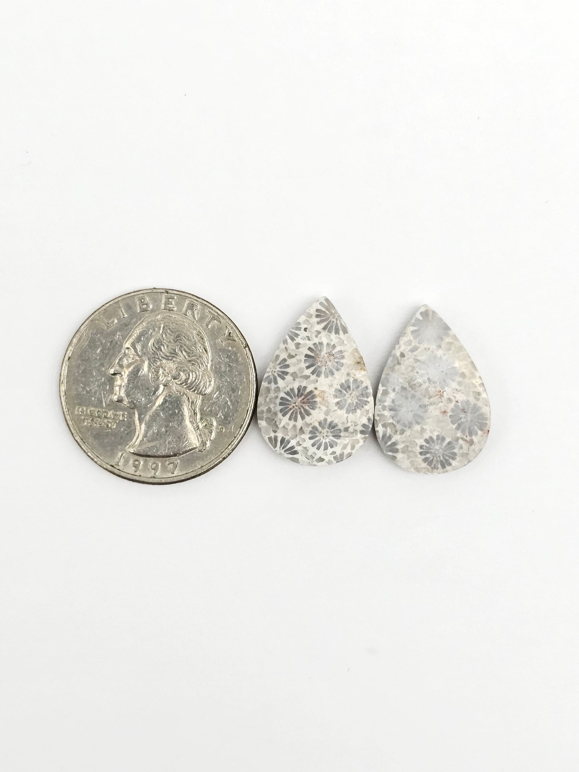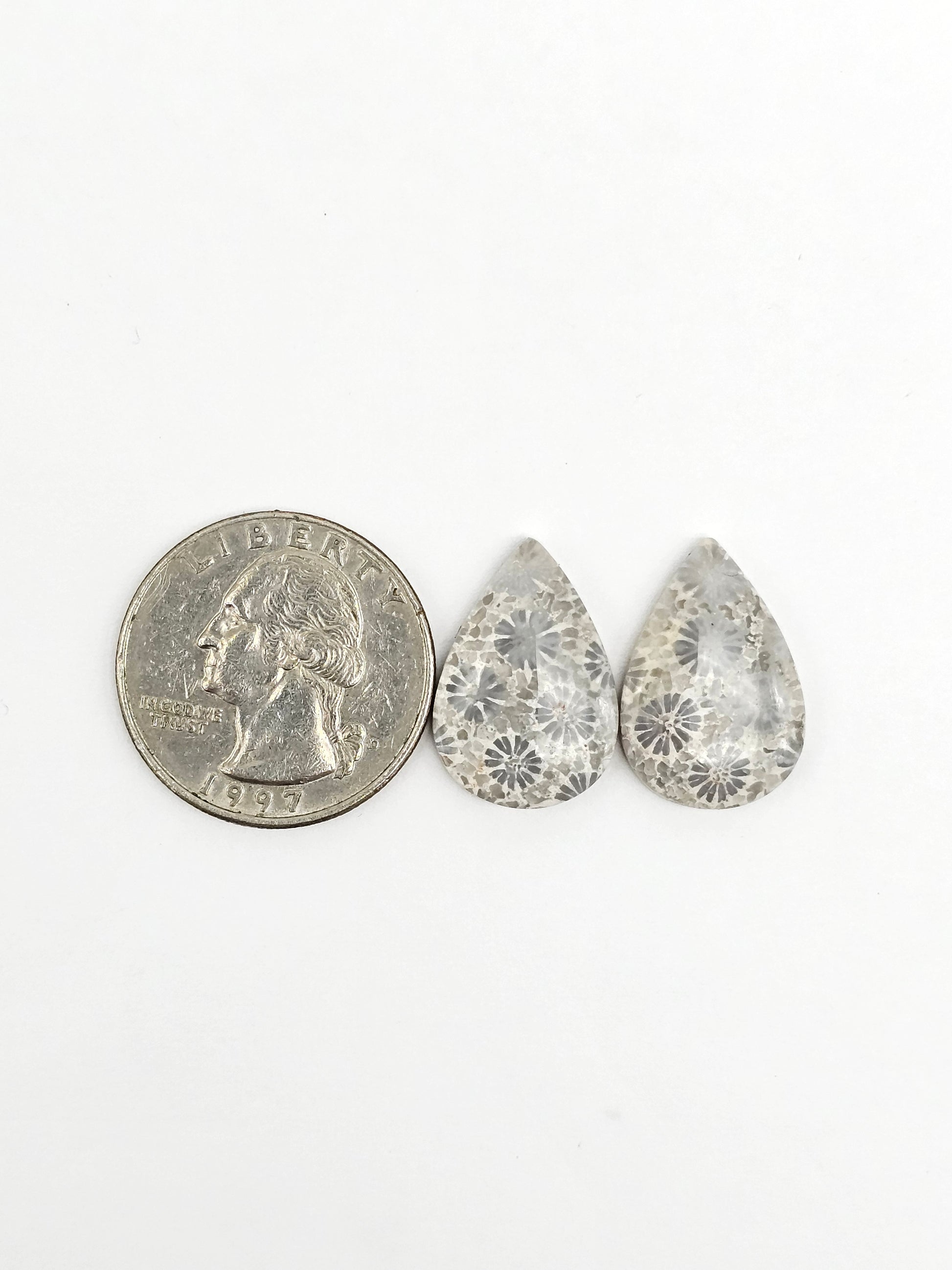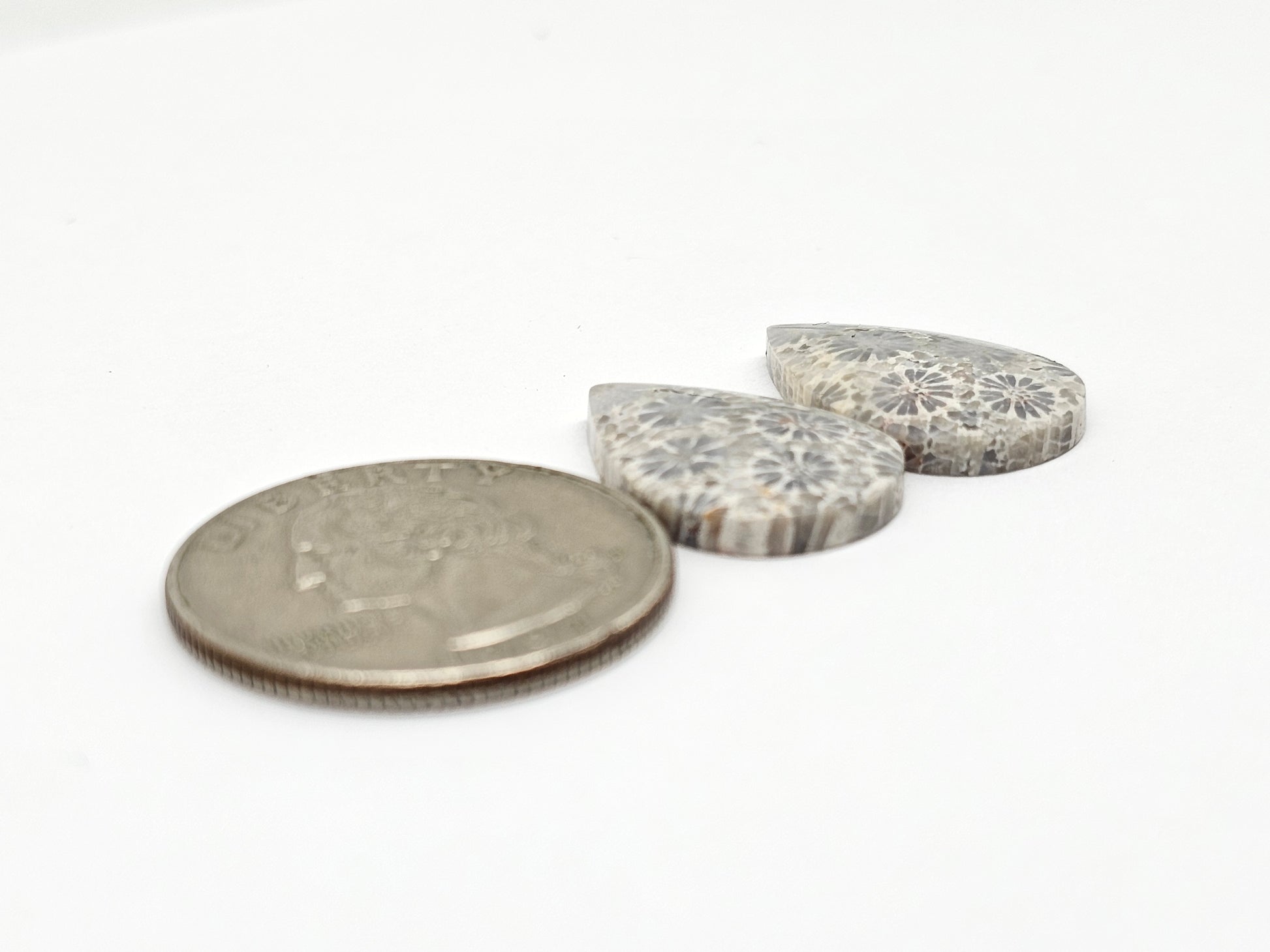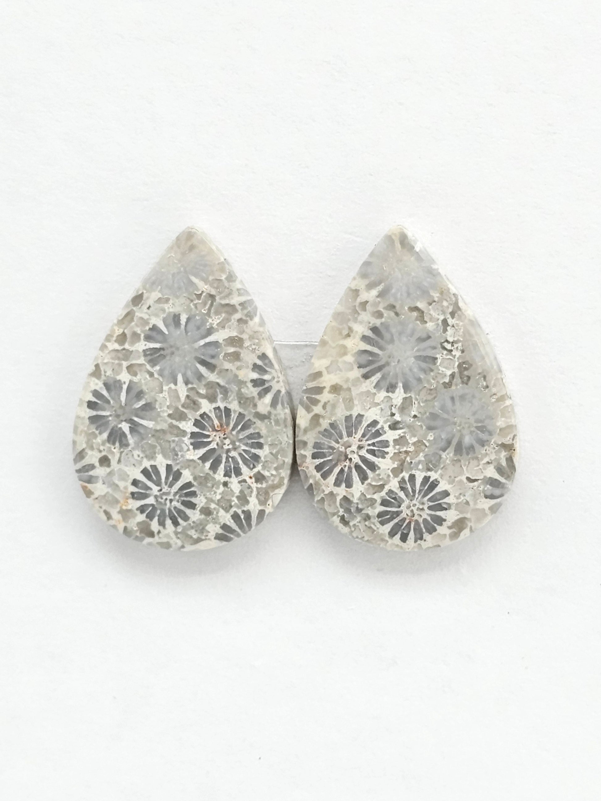 This fossilized coral pair showcases intricate natural flower-like patterns, formed over millions of years. Polished to a smooth finish, these matching cabochons are perfect for earrings or unique jewelry designs. A rare blend of history and beauty. Each piece is one of a kind, making it a special addition to any collection.