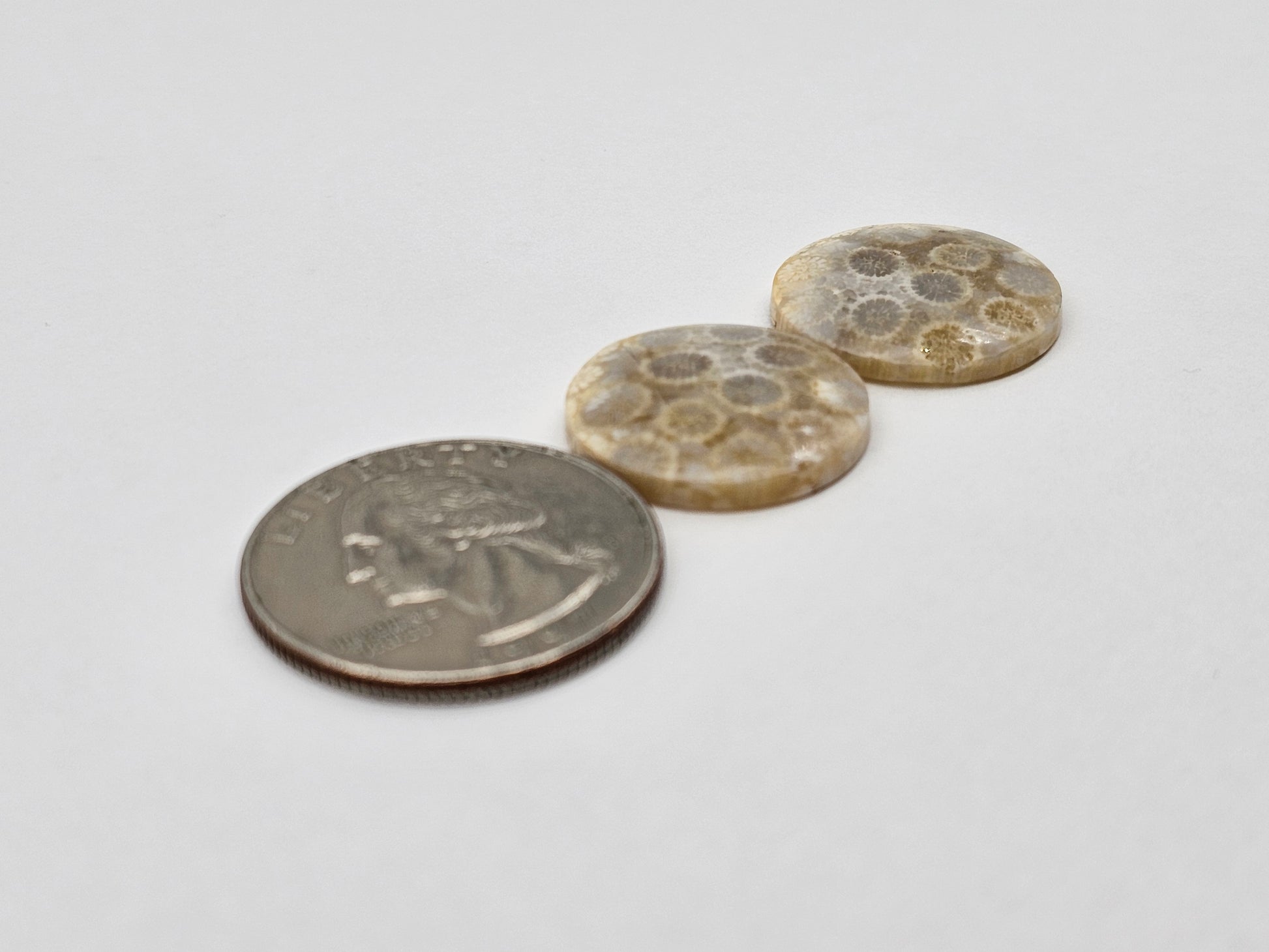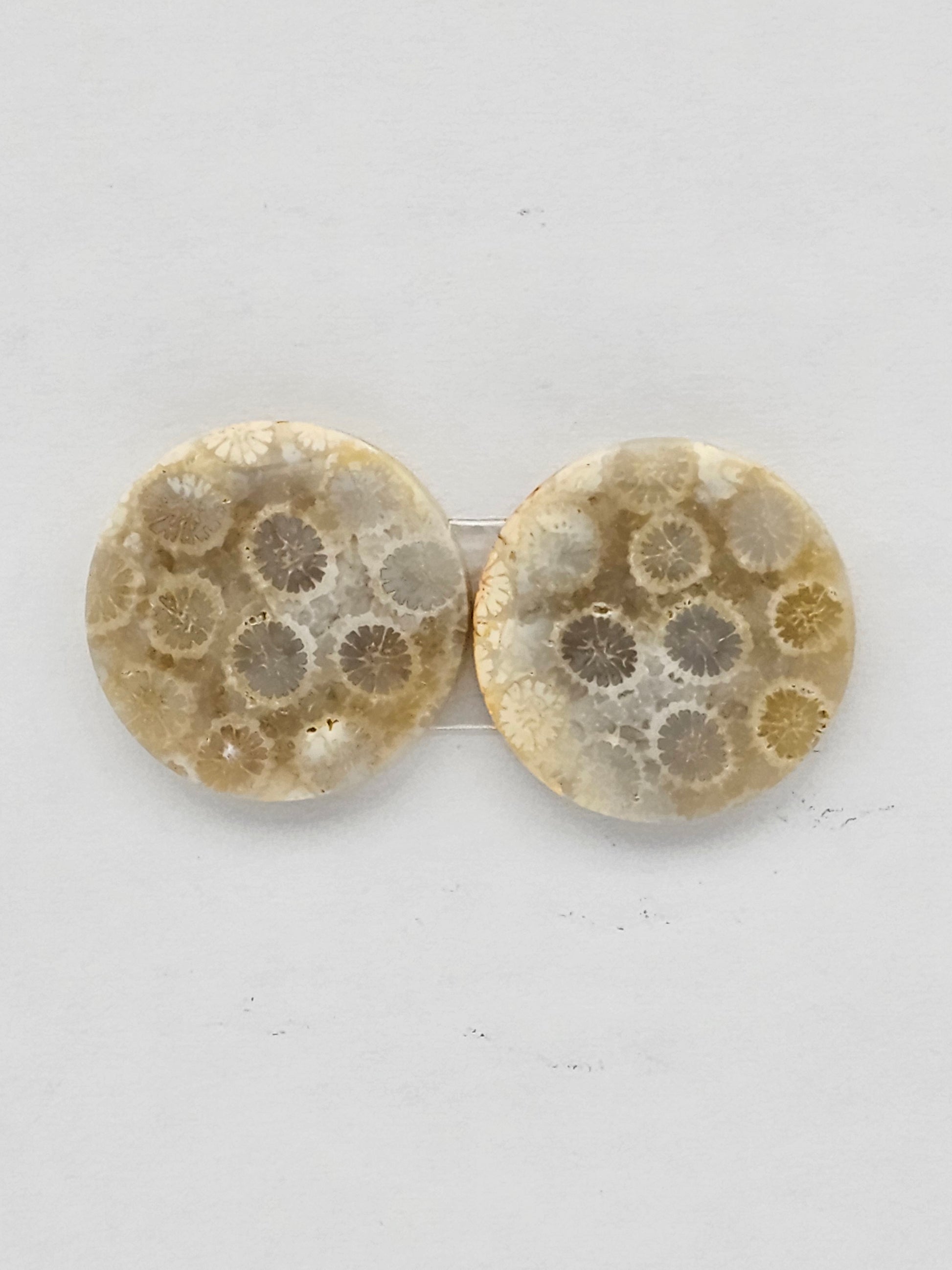 This fossilized coral pair showcases intricate natural flower-like patterns, formed over millions of years. Polished to a smooth finish, these matching cabochons are perfect for earrings or unique jewelry designs. A rare blend of history and beauty. Each piece is one of a kind, making it a special addition to any collection.