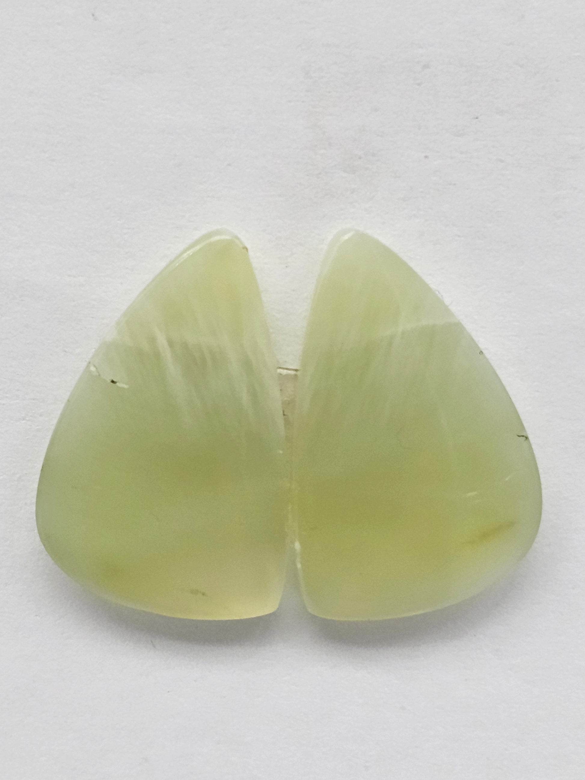 This beautiful jade cabochon pair features a calming yellow-green tone with soft translucency and a smooth polish. The stones are carefully matched, making them ideal for earrings or custom jewelry projects. Their natural color and clean finish bring an elegant touch to any design.